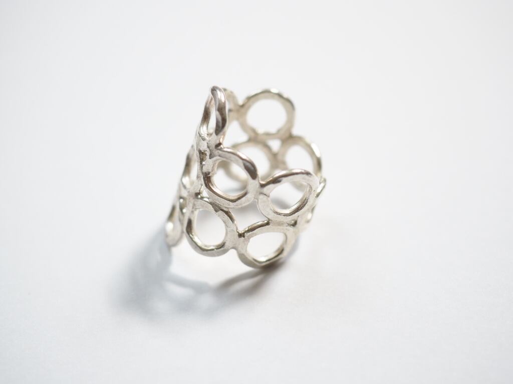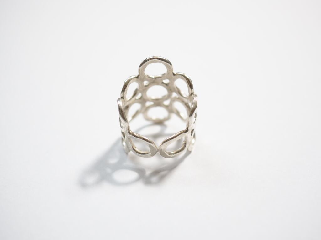 丸が連なったような遊び心のあるフォルムが特徴の、オープンワークカレンシルバーリング。