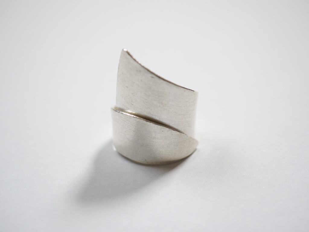 大胆なアシンメトリーフォルムが目を引く、アートピースのようなカレンシルバーリング。