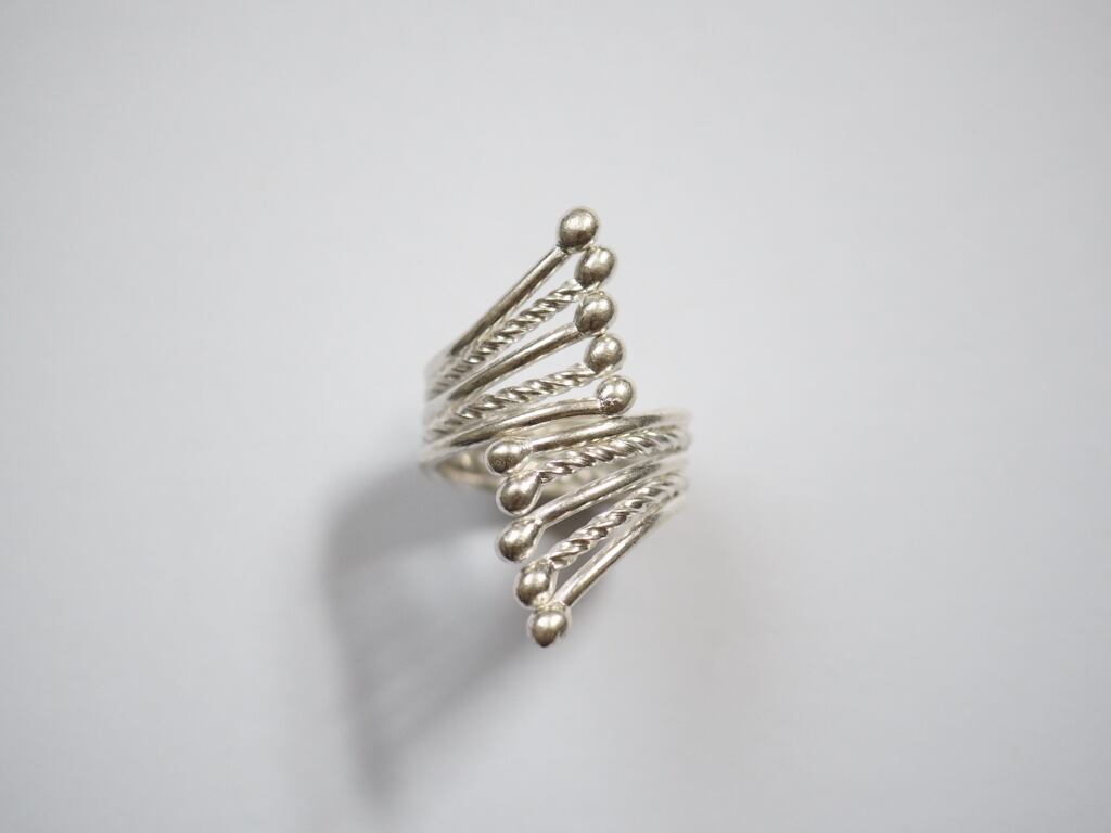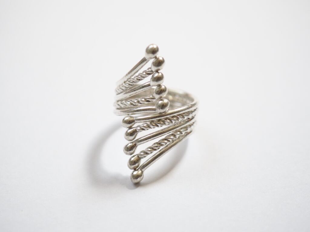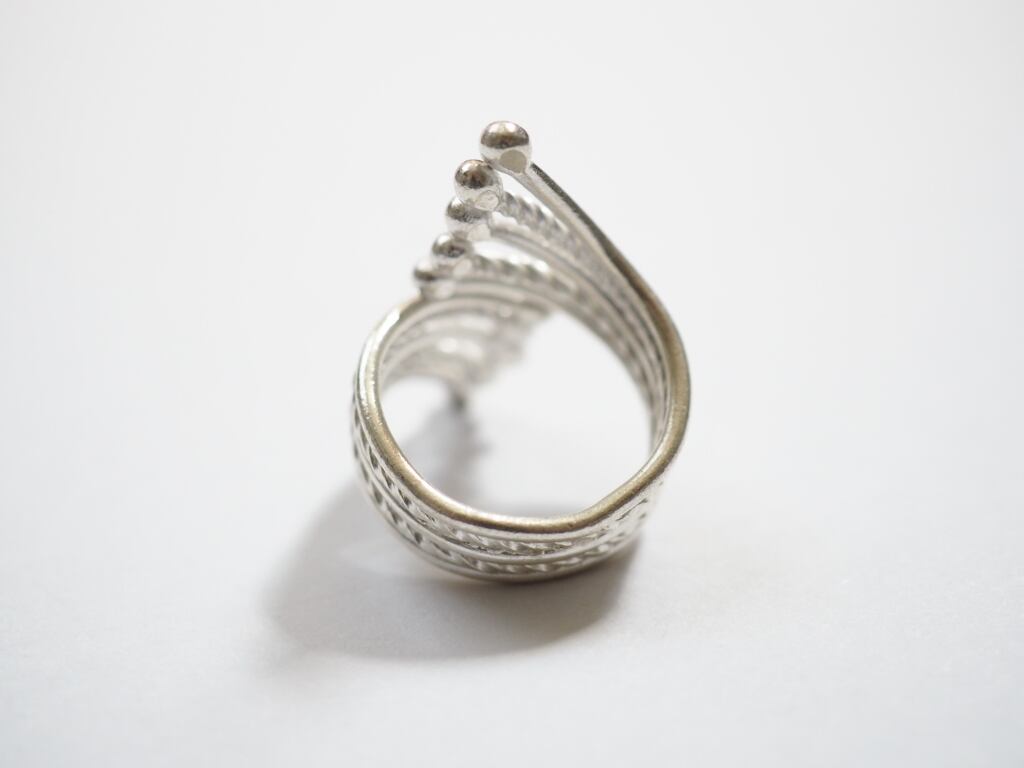 流れるようなスパイラル状のデザインに、細やかなビーズ装飾が重なった華やかなリング。
