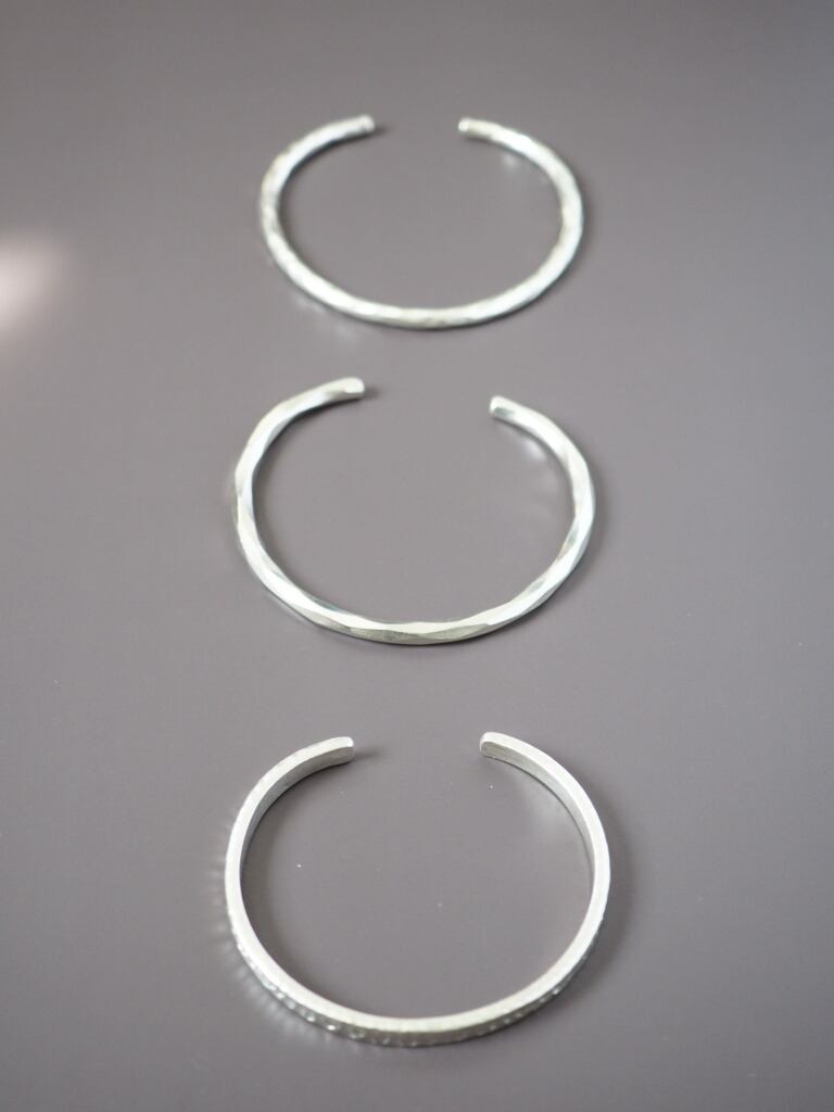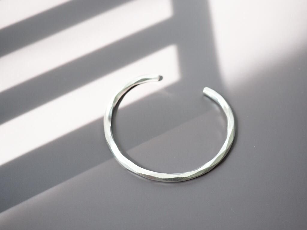 ミニマルで洗練されたフォルムに、ハンマード(槌目)仕上げの面が光を反射し、シンプルでありながらも存在感を放ちます。