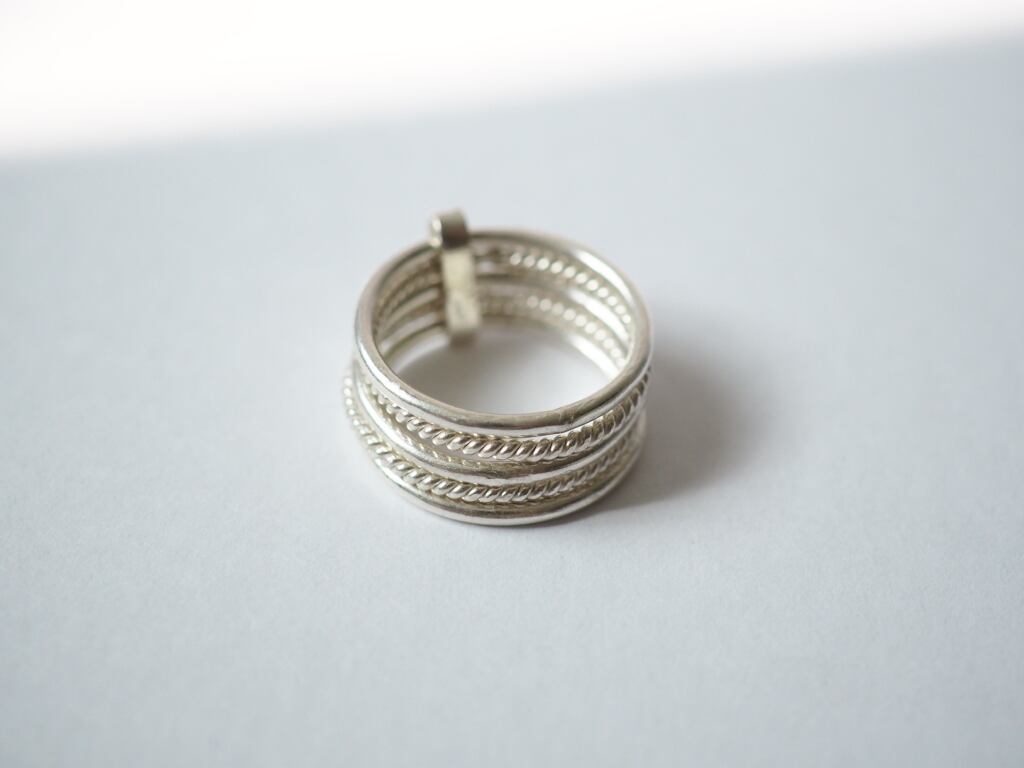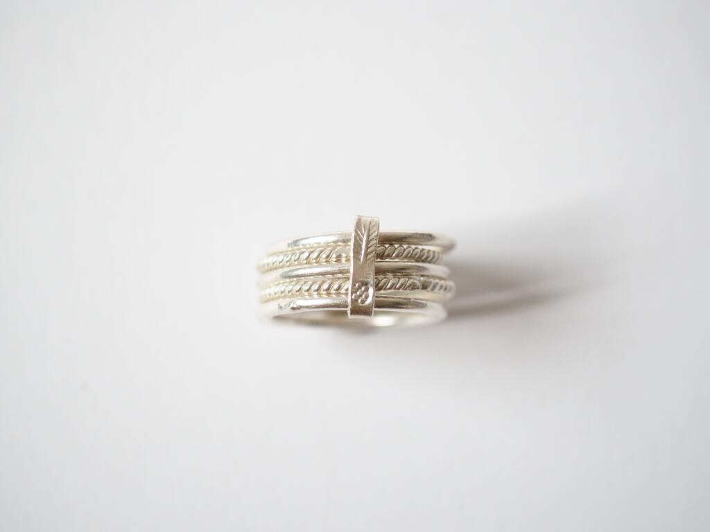 5本の異なるテクスチャのシルバーリングをひとつに束ねた、印象的なデザインのカレンシルバーリング。