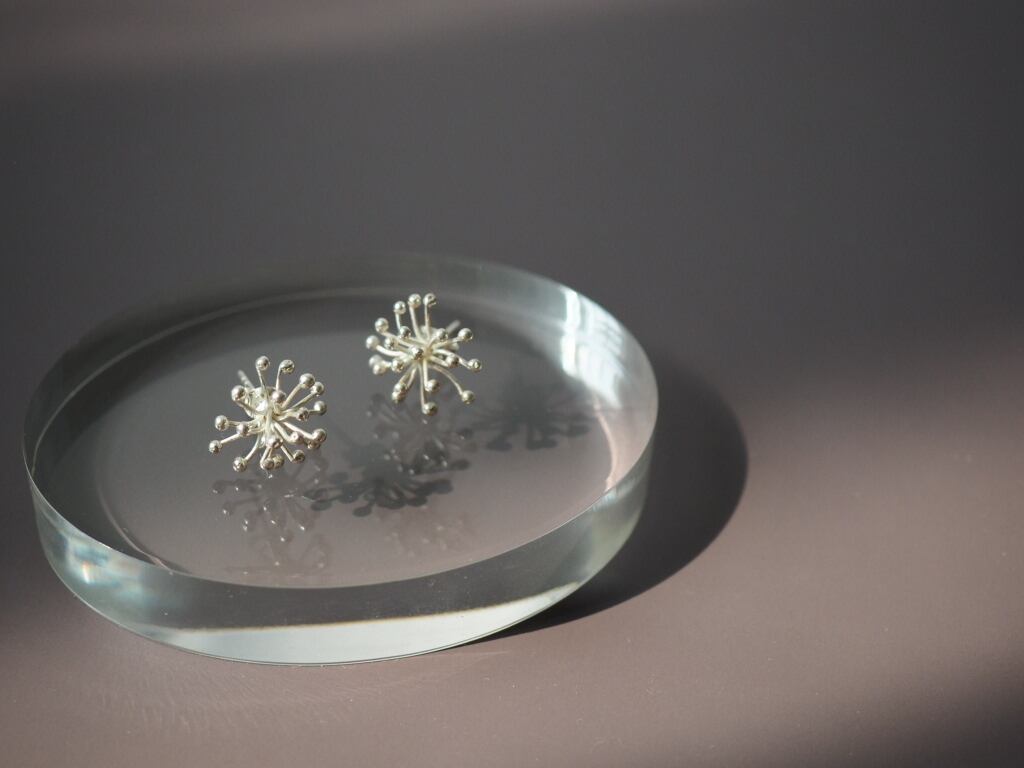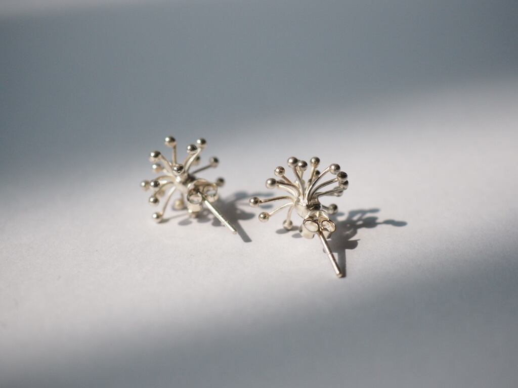 星が弾けたような、あるいは植物のつぼみが開く瞬間のような、美しい立体構造が魅力のカレンシルバーピアス。