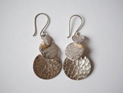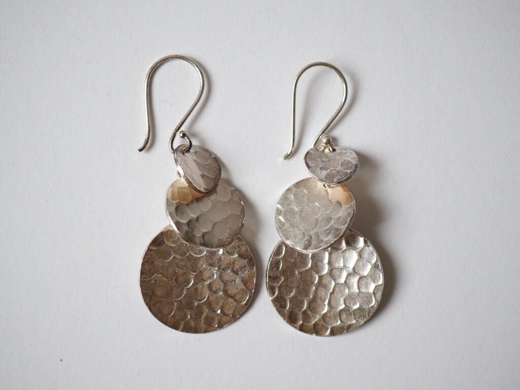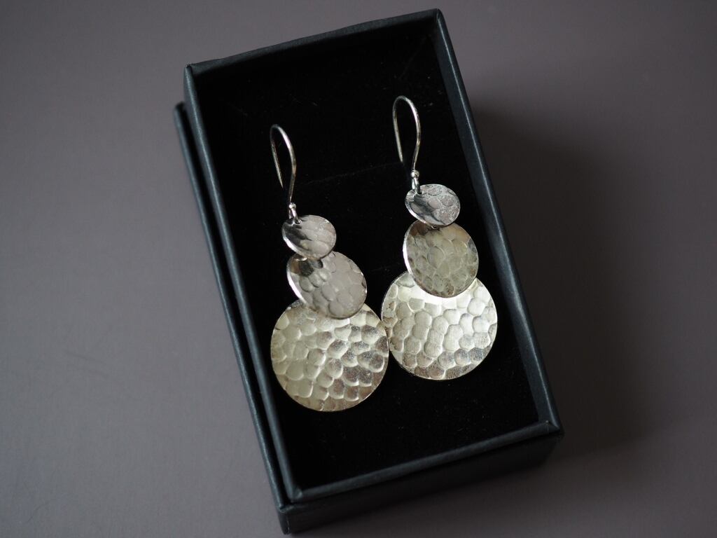 大小異なる3枚の円形プレートが揺れる、カレンシルバーのトリプルディスクピアス。