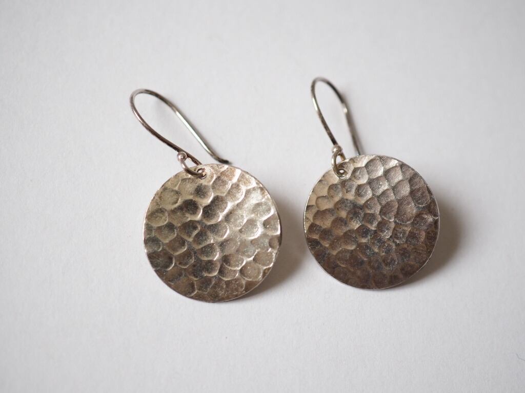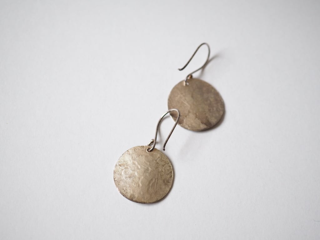 丸くシンプルなフォルムに、丁寧な槌目模様が美しく映える、カレンシルバーのラウンドピアス。