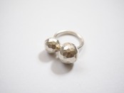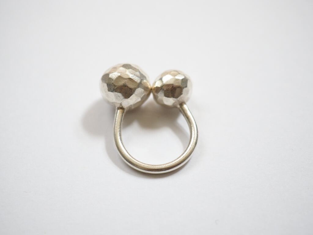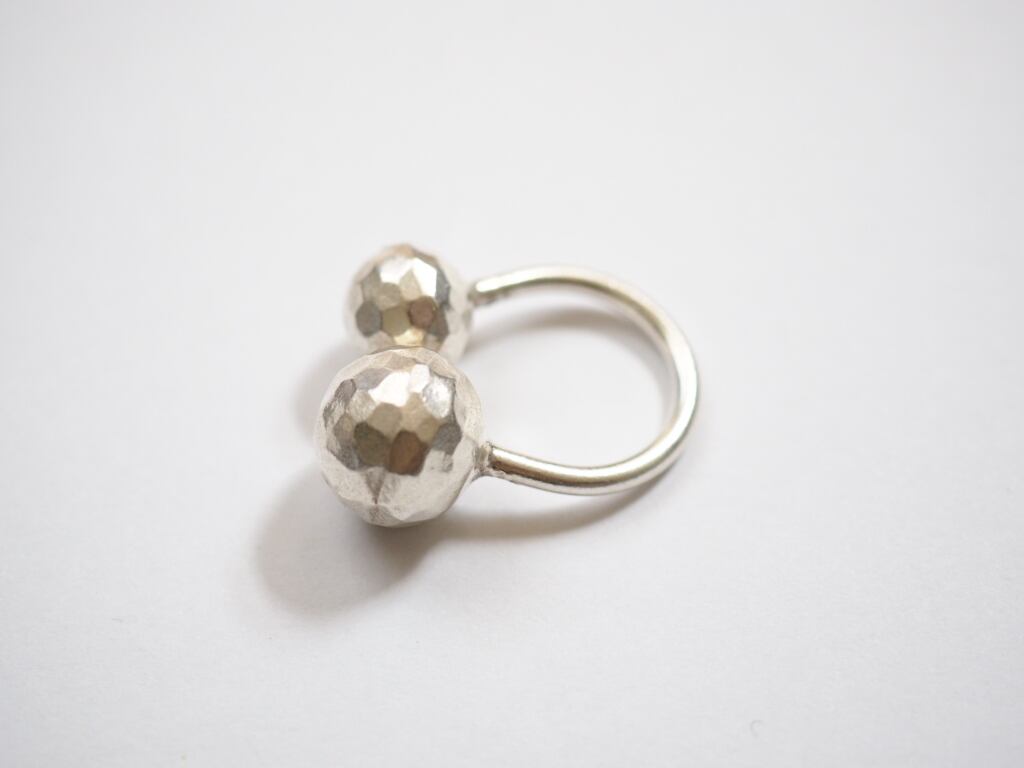ふたつの槌目ボールが指先に印象的なリズムを添える、カレンシルバーの個性派リング。