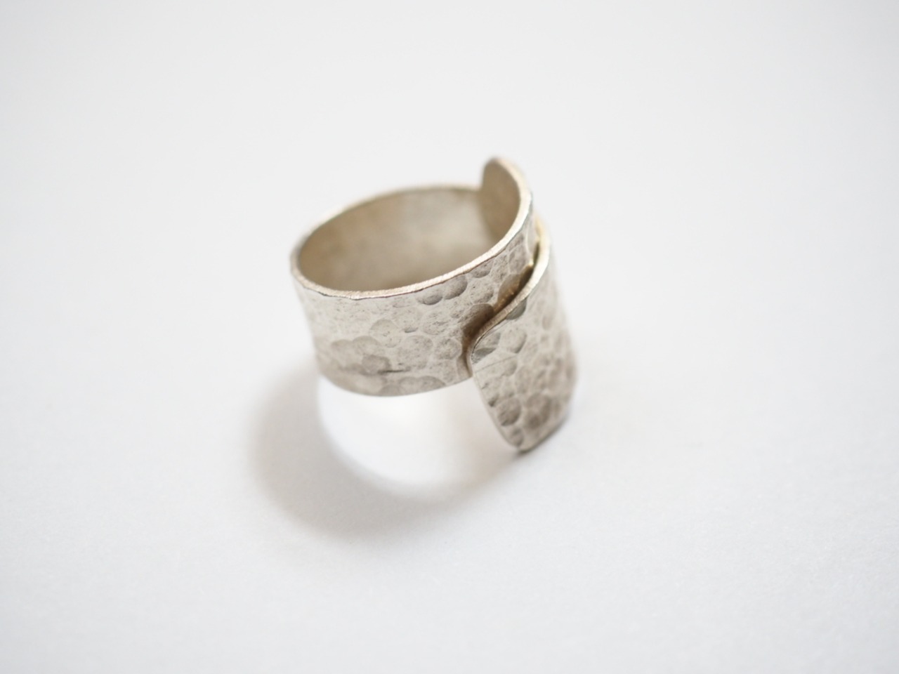 手作業で打ち出された槌目模様が、力強さと温もりを同時に感じさせるカレンシルバーのワイドリング。