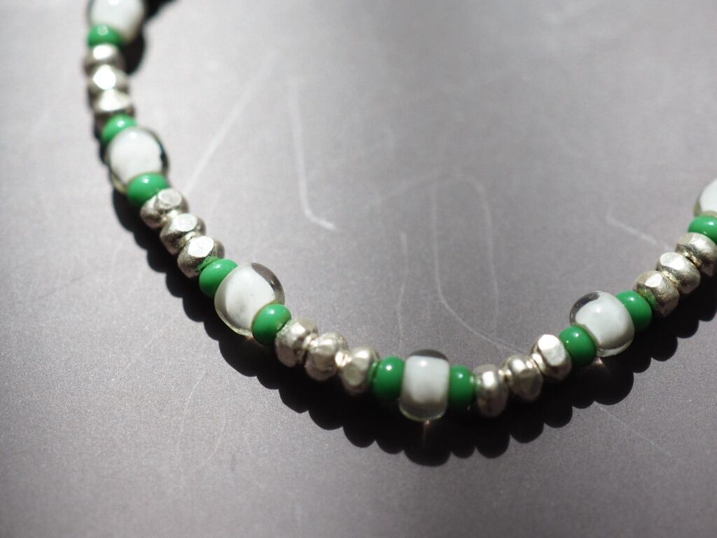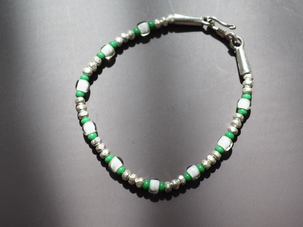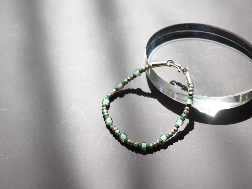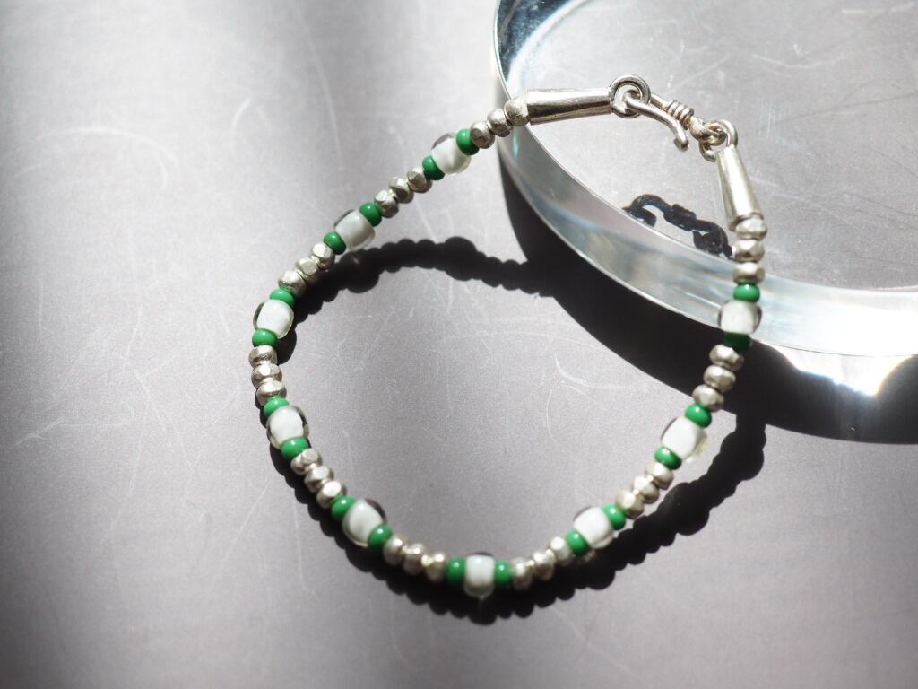 爽やかなグリーンとホワイトのガラスビーズをあしらった、カレンシルバーのハンドメイドブレスレット。