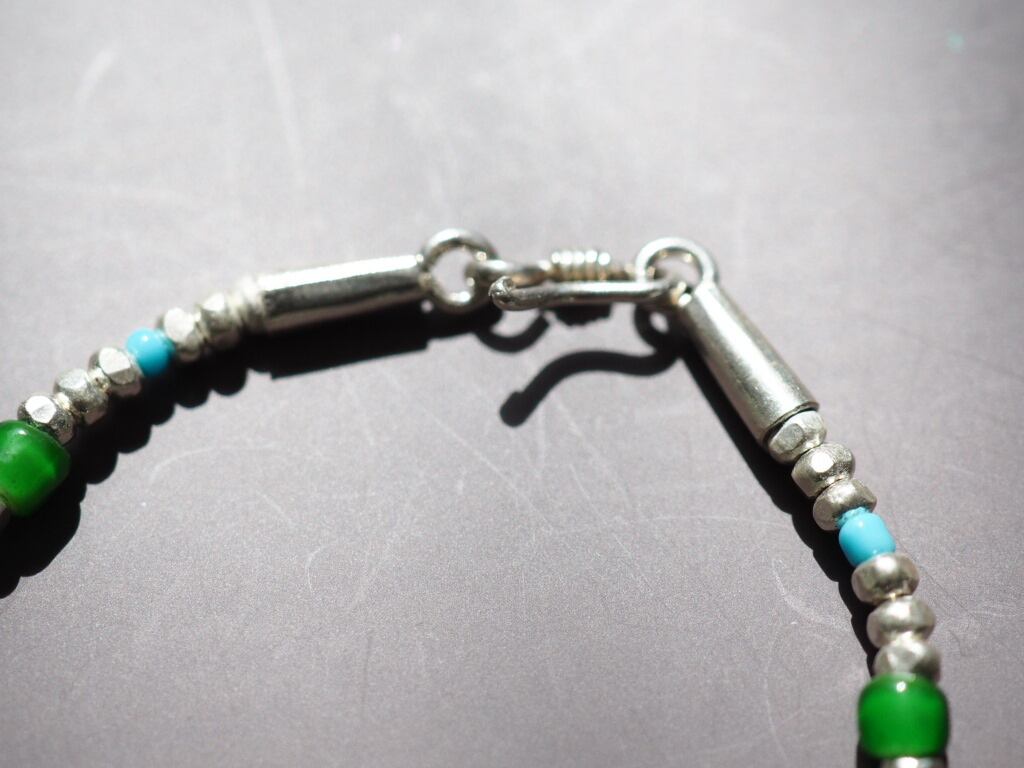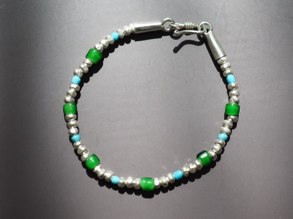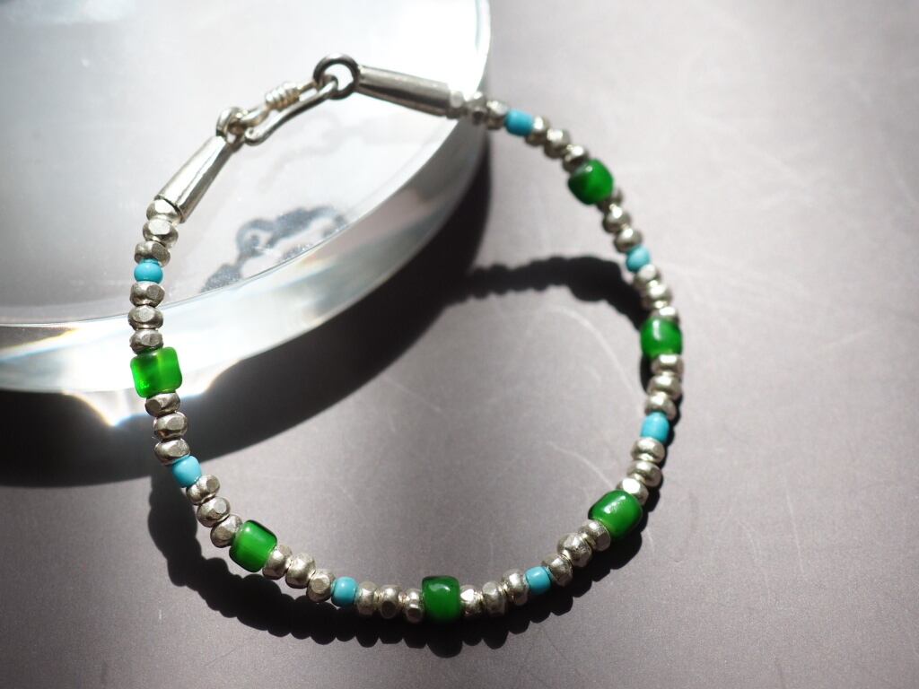 高純度のカレンシルバーと、鮮やかなグリーン&ターコイズブルーのビーズが調和した、爽やかな印象のビーズブレスレット。