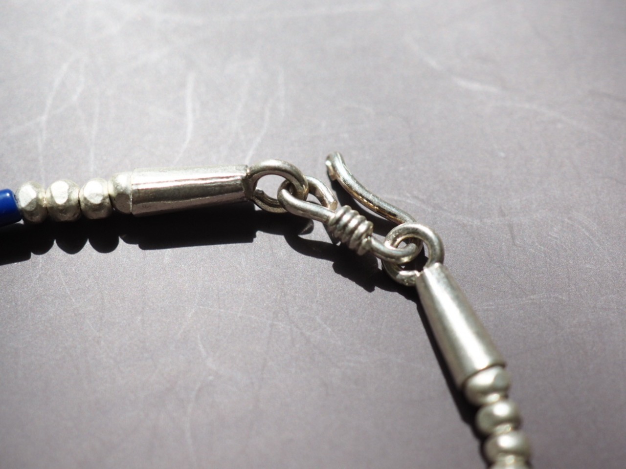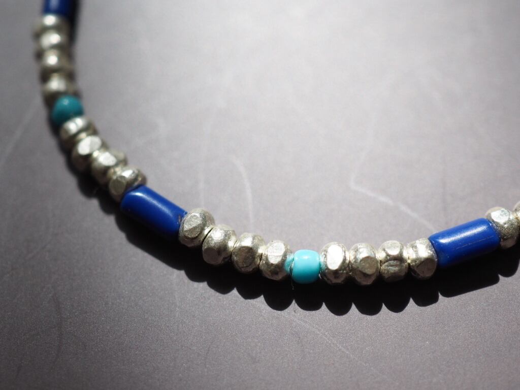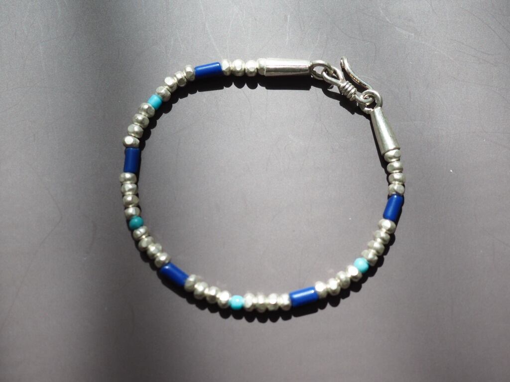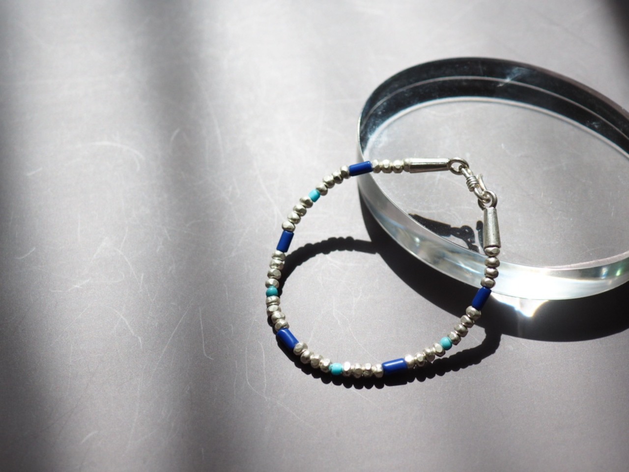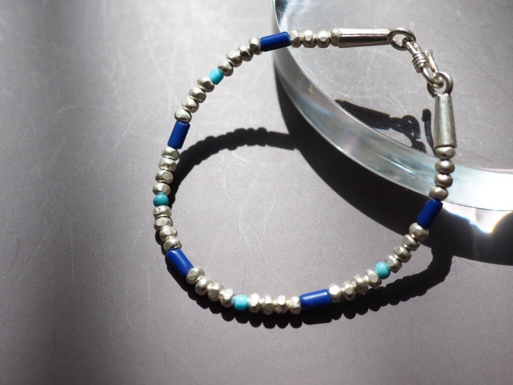 ネイビーブルーとターコイズブルーのビーズをアクセントにした、カレンシルバーのビーズブレスレット。