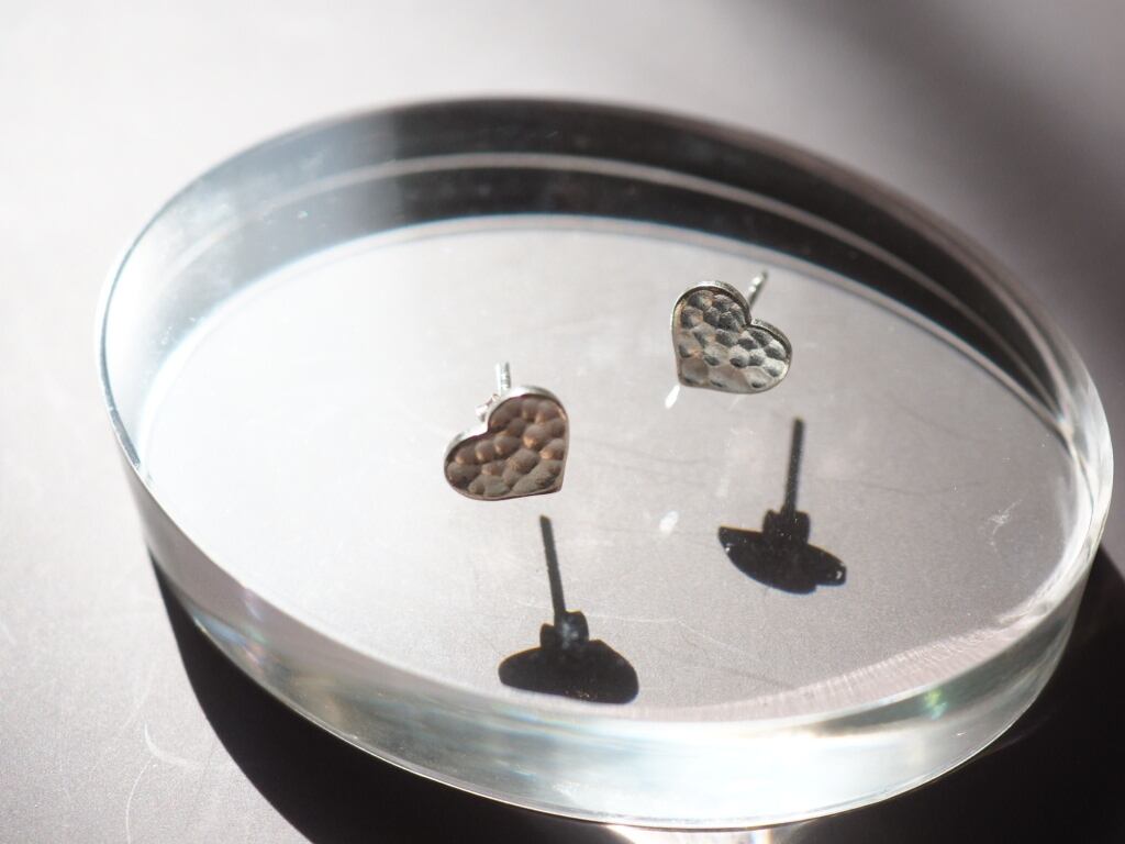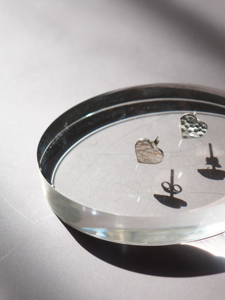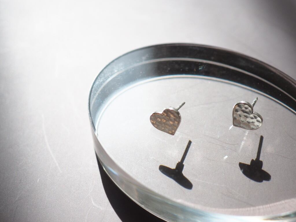 手仕事で丁寧に打ち出された槌目模様が印象的な、カレンシルバーのハート型スタッドピアス。
